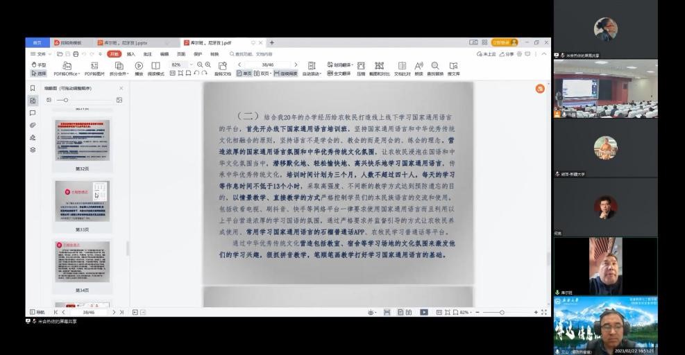 库尔班·尼亚孜校长题为《依托信息技术手段推动乡村振兴发展》的报告分享了自己创办的乌什县依麻木镇国语小学的办学理念、学校发展过程、中华文化大院和润疆文化生活超市的建设情况及取得的成效。库尔班·尼亚孜校长通过推动中华民族文化合理融入生活的举措,实现推进中华优秀传统文化通过生活化的产品走进家家户户的目标。库尔班·尼亚孜校长对农村现行开展的国家通用语言的学习培训和相关活动进行了总结和分析,他强调了农牧民学好国家通用语言文字的重要性。最后,库尔班·尼亚孜校长提出了依托信息化技术营造浓厚的国家通用语言氛围和中华优秀传统文化氛围的重要性,让农牧民切身融入国家通用语言和中华文化氛围当中,潜移默化地、轻松愉快地学习国家通用语言,传承中华优秀传统文化。